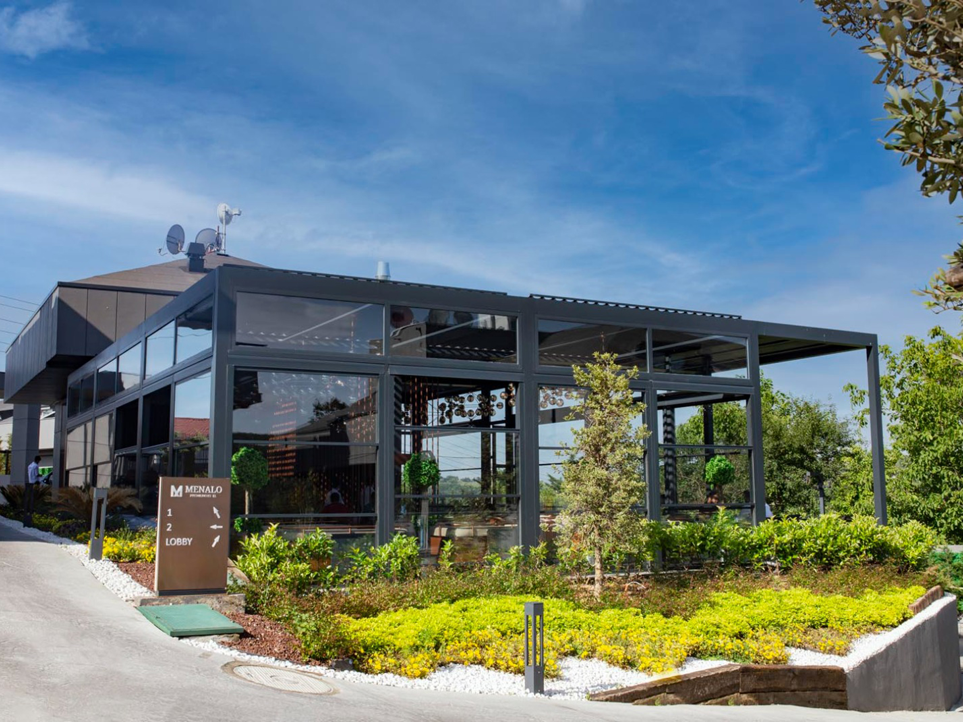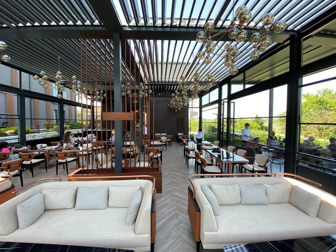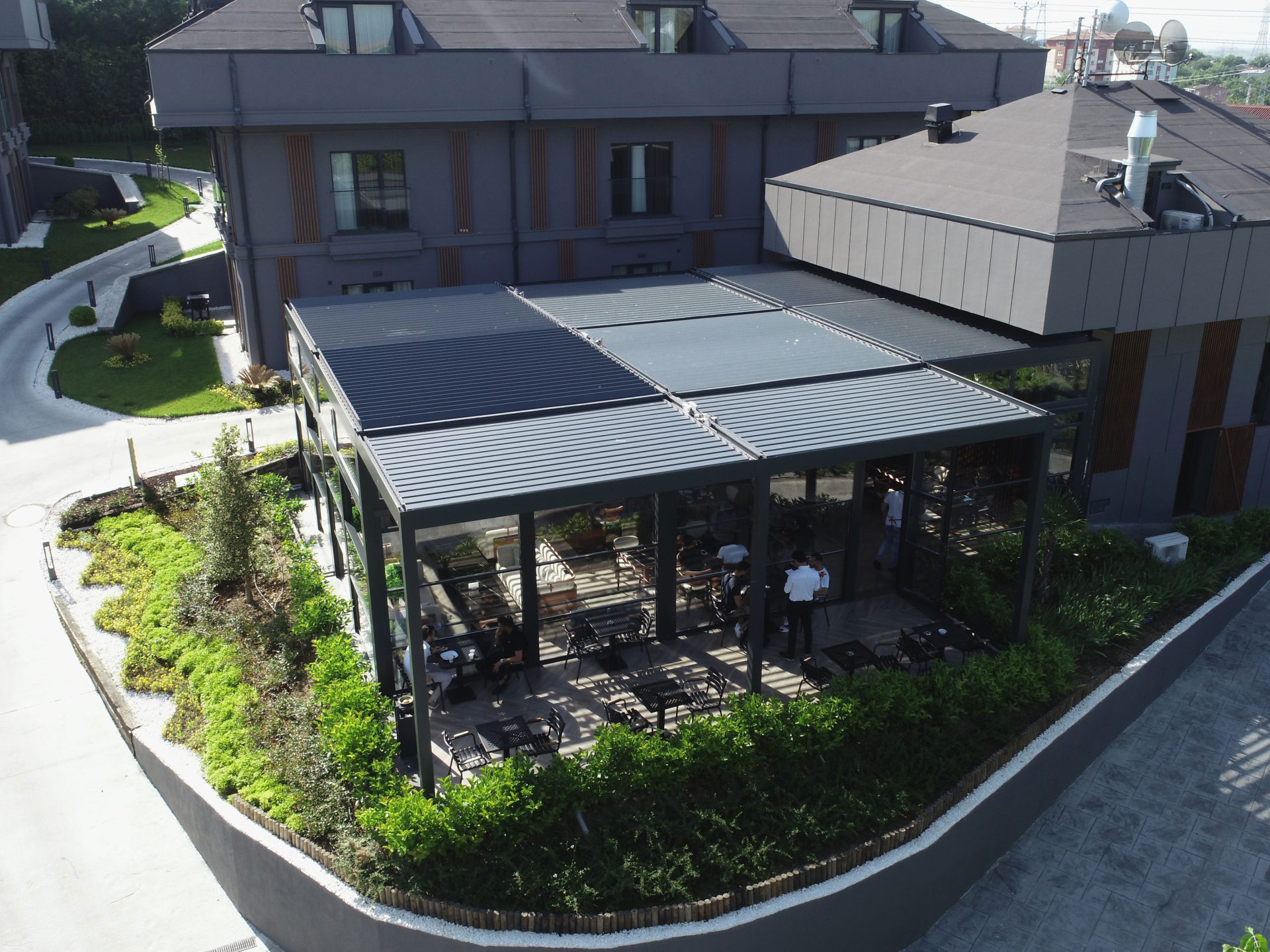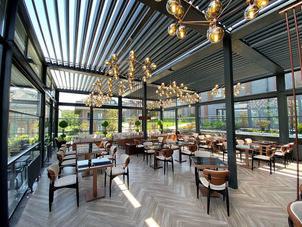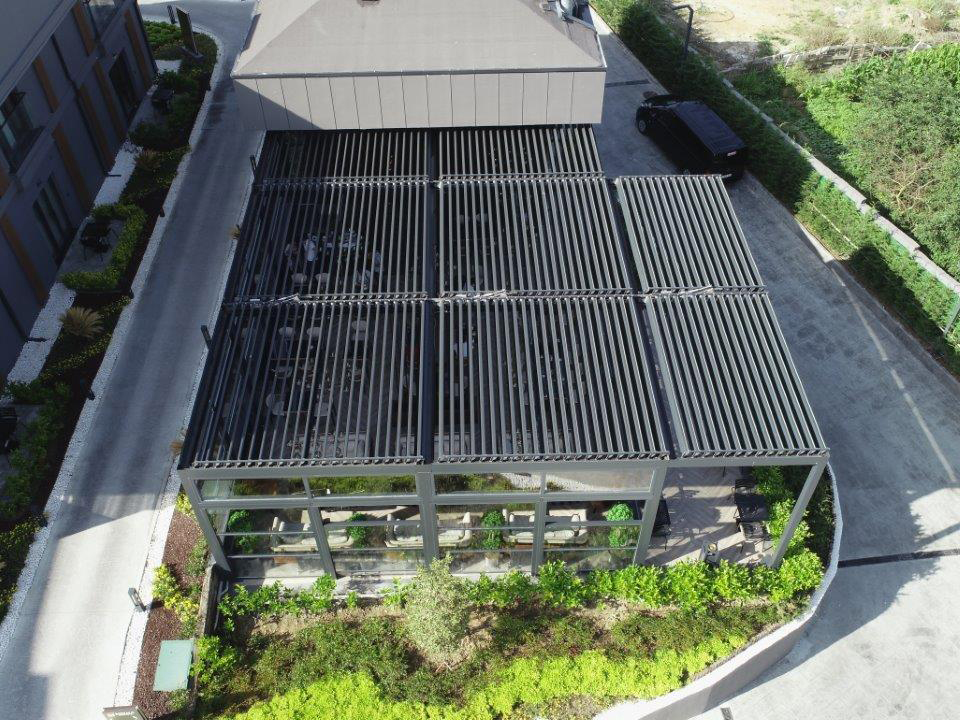 “Menalo Hotel Premium Istanbul Airport, a complex of five apartment-like buildings and one lobby building located just a 10-minute drive from the Istanbul Airport, recently underwent a successful redesign project with the installation of a Skylounge Bioclimatic pergola and motorised Up&Down Guillotine glass system. The hotel did not have a common area for dining or waiting for their guests, but by covering a 150m2 area in the middle of the land they own, adjacent to the main lobby building, the hotel now has a spacious dining area that can be used all year round.